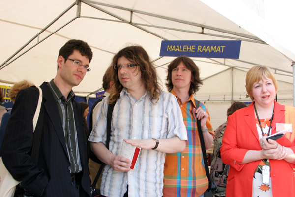 4 мая 2006. Тарту. Перед открытием фестиваля (слева направо): Игорь Котюх (Тарту, поэт), Дмитрий Кузьмин (Москва, литературный деятель), Дмитрий Беляков (Москва, художник), Ольга Ейнасто (Тарту, сотрудник Университетской библиотеки, со-организатор фестиваля).