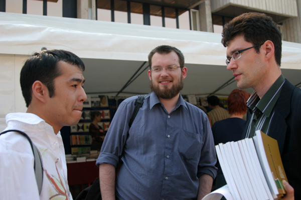 4 мая 2006. Тарту. Открытая сцена перед Университетской библиотекой. После презентации альманаха и дневной части программы на русском языке (слева направо): Ербол Жумагулов (Москва, поэт), Ааре Пильв (Тарту, поэт и переводчик русской поэзии), Игорь Котюх (Тарту, поэт).