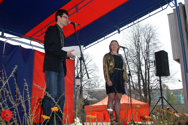 4 мая 2006. Тарту. Открытая сцена перед Университетской библиотекой. Игорь Котюх и Merca (Тарту, актриса театра Ванемуйне) рассказывают публике о новом тартуском литературном альманахе на русском языке "Воздушный змей".