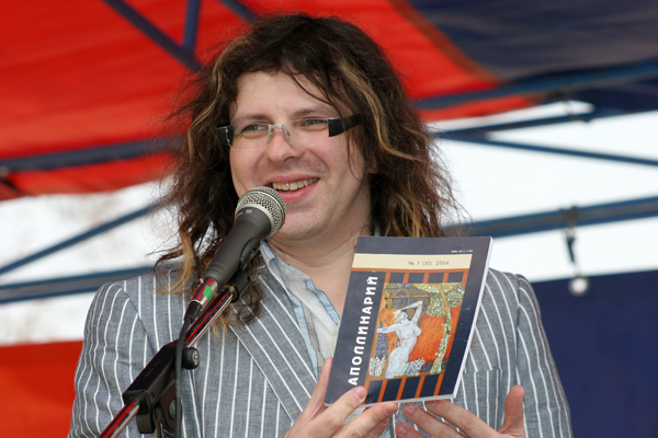 5 мая 2006. Тарту. Открытая сцена перед Университетской библиотекой. Вторая половина дня. Анонс вечернего мероприятия. Дмитрий Кузьмин рассказывает об альманахе "Аполлинарий", в котором была напечатана его лекция о русской поэзии XXI века.