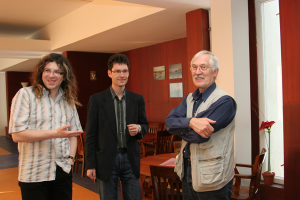 5 мая 2006. Тарту. Кафе Университетской библиотеки. Участники литературного вечера "3-К": Дмитрий Кузьмин, Игорь Котюх и Яан Каплинский договариваются о порядке выступлений.